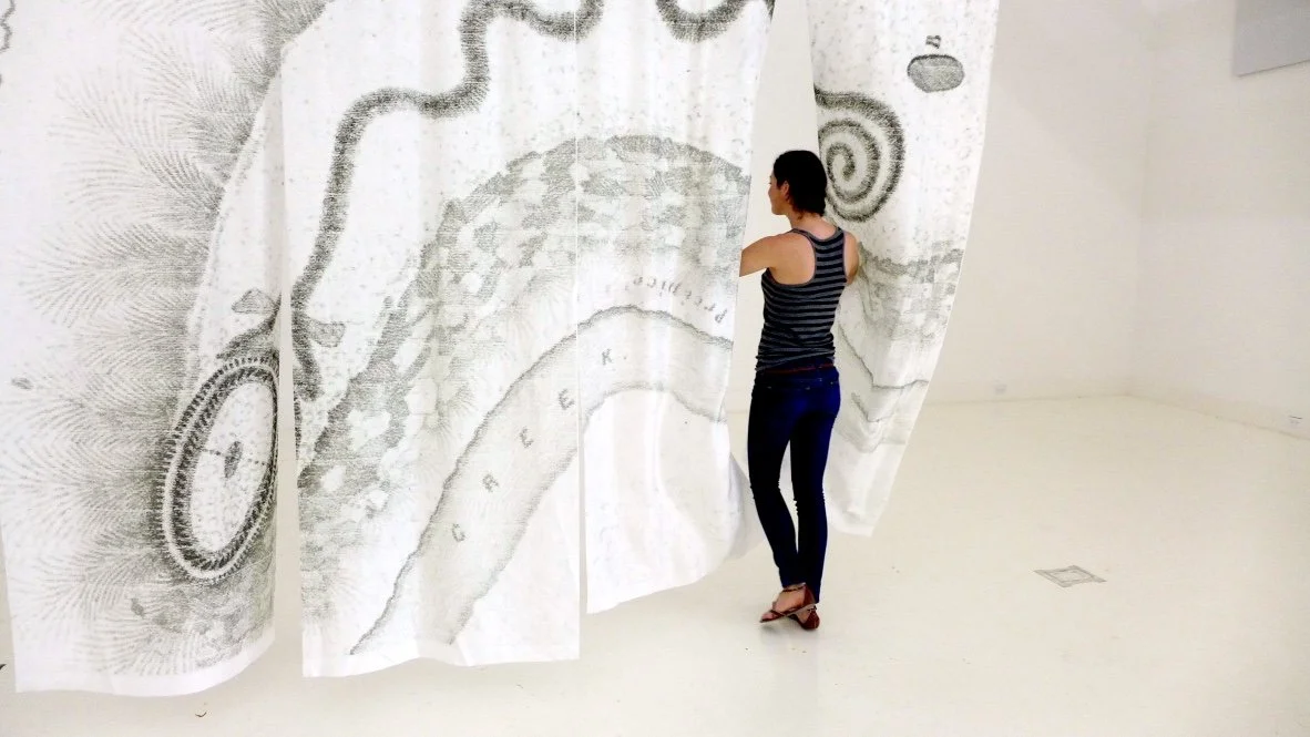 R&D has been supported by an Oregon Arts Commission professional development grant for further study, and a Robert Rauschenberg Residency where I made the set of silk panel maps as a backdrop for the images and stories.